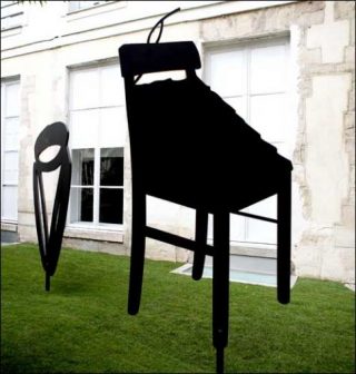 — Peter Coffin, Untitled (J. Beuys Fat Chair), 2010. Aluminium peint, 280 x 145 cm. Sculpture Silhouette (Bruce Nauman “Model for Trench Shaft and Tunnel” 1978) », 2010. Aluminium peint, 223,5 x 221 cm