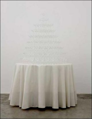 Voilà comment ce jeune artiste de trente huit ans travaille. Une idée, une envie, et tout de suite après, le besoin de la réaliser d’une manière ou d’une autre. La poésie et la légèreté font le reste. Expérimentateur, il n’en reste pas moins pédagogue. Il nous montre le dessous des cartes. Champagne Pyramid est une table qui circule automatiquement dans toute la galerie. Une montagne de verre la surmonte tandis qu’un moteur caché sous ses voiles permet à l’ensemble de se déplacer. CQFD.