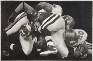 La série des footballeurs est tirée d’un article du New York Times traitant des problèmes de santé physiques et mentaux que rencontrent les joueurs suite aux blessures qu’il reçoivent. L’échelle monumentale, la composition dynamique ressérée autour des joueurs en pleine action plonge le spectateur dans la brutalité du jeu et la violence des corps qui s’entrechoquent.