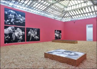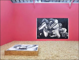 La première surprise qui nous attend lorsque l’on entre dans la salle d’exposition de «The Competition Myth», c’est justement la scénographie qui a été montée pour présenter un ensemble de dessins monumentaux exécutés au graphite. En effet, les murs de la galerie ont été peints en rose, et le sol est couvert d’une épaisse couche de copeaux de bois. Contemplant les immenses dessins placardés sur les murs, qui représentent des joueurs de football américain s’affrontant en plein match, nous avons alors l’impression de fouler le sol d’une arène, où nous seraient relatés les exploits de ces héros et gladiateurs des temps modernes, à savoir les sportifs professionnels.