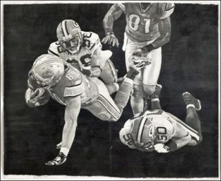 Les corps sont donc en perpétuel mouvement, à la poursuite les uns des autres, afin de contrôler le précieux ballon ovale. Les dessins de Karl Haendel demeurent ainsi extrêmement rigoureux et précis dans leurs traits, donnant vie à chaque détail ou à chaque expression qui se devine sur le visage des sportifs (effort, fatigue, tension, surprise).