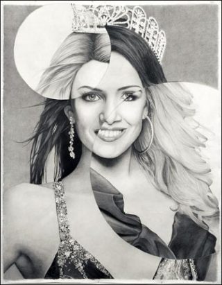 Le portrait de la miss est présenté horizontalement sur un socle carré en contre-plaqué. En réalité, cette œuvre est le fruit de la juxtaposition du portrait de deux jeunes femmes (une blonde et une brune), dont les traits coïncident presque parfaitement. Les jeunes femmes, malgré quelques différences physiques, dans leur coiffure ou leur style, sont pratiquement interchangeables. Surtout, elles se confrontent à des critères de sélection, ainsi qu’aux regards des jurés ou des spectateurs —à l’image des sportifs professionnels.