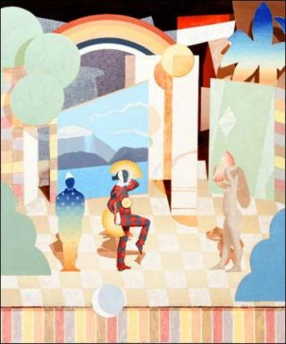 Cette iconographie s’impose le plus visiblement dans Desert Stage (2015), le tableau clé de l’exposition, dont le titre pourrait se traduire par «scène de théâtre dans le désert» (à moins qu’il ne faille comprendre «décor de théâtre évoquant le désert»). L’Arlequin qui y figure évoque le célèbre rideau de scène Parade réalisé par Picasso en 1917. A y regarder de près, d’autres détails confirment cette relation comme la colonne qui repose sur le pavement en damier ou le fragment de paysage circonscrit par un panneau biseauté; reprise des montagnes et du ciel bleu qui, chez Picasso, se découpent entre les pans d’un ultime rideau de velours rouge et les ruines d’un paysage romantique. En revanche, l’acrobate, le cheval ailé et le paysage bucolique, tous ont disparus. La table et les convives se sont également volatilisés laissant Arlequin en tête à tête avec une jeune fille nubile tirée d’un tableau de Balthus (Nu devant le miroir, 1955).