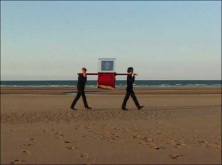 Sous des apparences légères et drolatiques, The Holy Flag de Martin Le Chevallier est une œuvre polémique. Hélas, l’écueil de l’art politique n’est pas loin: structurée sur le modèle linguistique — signifiant / signifié —, cette œuvre se résume à un simple message.