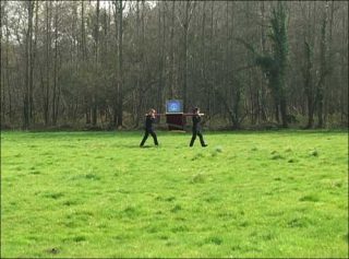Enfin une vidéo-projection retrace le parcours de la châsse-reliquaire depuis Rennes jusqu’à Bruxelles devant le siège de l’Union européenne. La bande-son n’est autre que L’Hymne à la joie précédemment mentionné. Ainsi, accompagné de cet air lyrique à souhait, ce trajet prend des allures d’épopée, sinon de croisade. L’écart entre la musique et l’action représentée, conjugué aux décors du «plat pays», mène évidemment au grotesque.