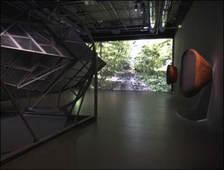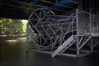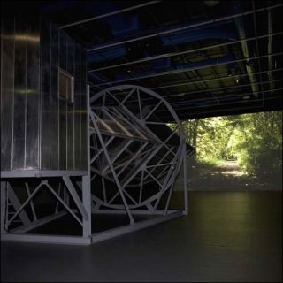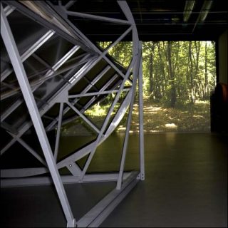 L’Espace 315 est plongé dans le noir, et file, tel un tapis volant, par les sentiers d’une forêt domaniale. La pièce tremble d’un sourd grondement, ponctué par le passage régulier d’un bruissement de volatiles indéterminés. Au milieu de la salle, sol et murs gris, émerge, et s’y fond, une structure métallique de la même teinte. Une forme étrange, placée dans la ligne de mire du travelling avant, qui s’enfonce indéfiniment dans les sous-bois, et tournée vers le ciel: il s’agit d’une réplique réduite de l’antenne Horn, qui capta pour la première fois le bruit fossile du big bang, dans les années soixante.