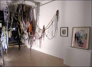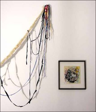 Passée l’impression d’ensemble, ronde et colorée, que lui distillent les compositions et les installations, on a envie de comprendre de «quoi c’est fait». Réponse: de matériaux d’artistes, tissus, gouaches, papiers déchirés et collés, dessins, pigments collés à même le support; mais aussi d’attributs féminins: rouge à lèvres, vernis à ongles, bas dépecés, collants déchirés, cheveux parsemés.
