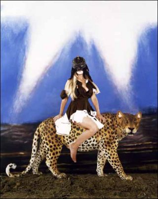 De l’autre, des sculptures, réalistes et fantastiques, comme celle d’une femme assise sur la dépouille d’un ours brun, cette autre d’une femme debout habillée de l’écorce d’un arbre, ou une série de trophées mixant mannequins féminins et têtes animalières naturalisées, ou encore la femme vêtue d’un costume de Pierrot et casquée d’une tête d’hippopotame…