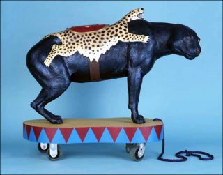 Le bestiaire de Marnie Weber est celui du cirque. Les bandes verticales rouges et blanches de la toile de chapiteau, des Buren du pauvre, servent d’ailleurs de motifs ou de fond à plusieurs compositions. Les singes, mais pas seulement eux, sont savants, les autres animaux, des bêtes de scène, tandis que les humains sont recouverts de peaux de bête.