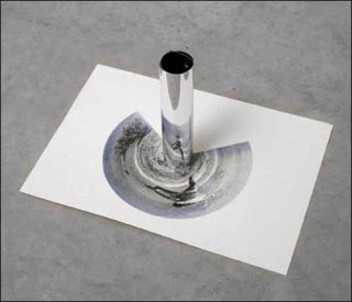 Composition d’objets (livre, briquet, crayon, rouleau de scotche), en apparence désordonnés, celle-ci se joue des déplacements du spectateur et garde, comme en secret, l’emplacement exact depuis lequel ses formes dessinent le mot «Mobil». Ironie mordante, le mot ici ne devient visible que si le spectateur s’immobilise; s’il fige son point de vue à un endroit donné et renonce, au moins pour un temps, à le faire varier.