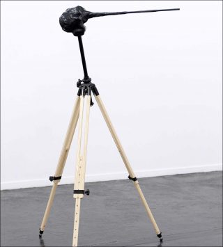L’installation Swimming est une référence à un autre artiste important dans l’histoire de la galerie Thomas Bernard – Cortex Athletico : Rolf Julius. L’œuvre est constituée de deux bols remplis d’eau contenant chacun un haut-parleur relié par des câbles l’un à l’autre et à un lecteur CD. Elle illustre l’exploration de l’espace sonore et des techniques de diffusion du son menée par Rolf Julius, avec un intérêt constant pour la relation au monde naturel.