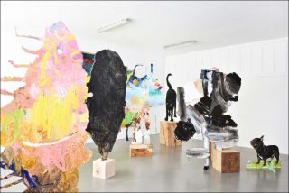 Ida Tursic et Wilfried Mille vont plus loin encore en sortant, littéralement, leurs peintures du cadre. Leurs Shape Paintings (2019) se présentent comme des panneaux de bois découpés en fonction des formes abstraites ou figuratives qui sont peintes dessus. Disposées devant les tableaux encadrés et fixés au mur, ces créations viennent les redoubler et leur donner une épaisseur dans l’espace. Le visiteur, obligé de déambuler parmi ces Shape Paintings, adoptent ainsi un regard qui superpose les œuvres les unes sur les autres, multipliant les possibilités de perception. La toile murale Black Flower (2019), qui représente des fleurs noires, trouve une résonance spatiale dans le parterre de fleurs en bois présent à ses pieds. Un véritable mille-feuille pictural.