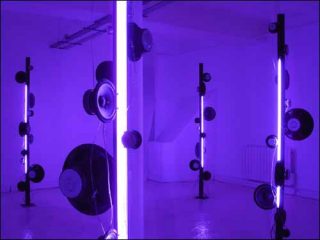 — Still no guides, 2008. Haut parleur, acier, tubes fluo, cables. Dimensions variables.