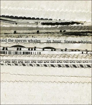 D’autres sont des œuvres de la série Naked Eye (œil nu), qui consiste à photographier les tranches latérales de livres de poche (qu’on appelle aussi les gouttières) en train d’être feuilletés, laissant apparaître des fragments de textes et d’images à l’intérieur de ce cadre vertical. Enfin figure un certain nombre d’images plus abstraites, reproductions d’images trouvées de ciels nuageux, et propres photographies d’Erica Baum d’ombres projetées sur des paysages urbains.