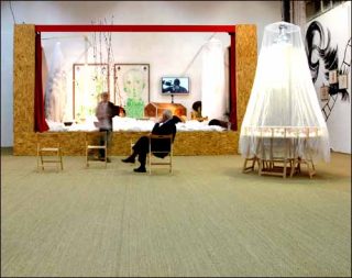 Notre déambulation s’achève au pied de Climbing Down. Trois lits superposés accueillent de part et d’autre des sacs en plastique, bagages de fortune pour personne en transit. Les échelles disposées sur les côtés désignent la possible ascension. Elles soulignent cette tour de Babel qui ne demande qu’à proliférer. Apologie d’une éventuelle élévation ou mise en avant du déracinement de l’homme, l’oxymore induite par le titre nous confronte une fois de plus à un mouvement, à un va et vient incessant.