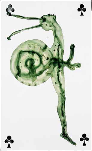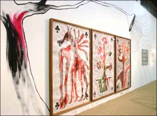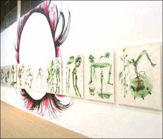 On s’avance vers Dreams Catchers qui s’étend sur le mur comme une succession d’images passées aux rayons X. Ces aquarelles aux couleurs verdâtres rehaussées ça et là d’orange et de rose donnent le ton. Des clous, empreintes translucides, épinglent des rêves surréalistes, les emprisonnent dans la trame du papier. Bestiaire fantastique, animaux et corps humains aux profils qui se mélangent, portent sur leurs contours les marques de leurs captures.