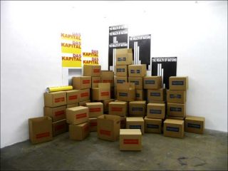 Pression et Depression… Yann Toma dessine les contours d’une croissance en dents de scie, fidèle lui aussi au langage formel de l’économie, où le chiffre est à la courbe ce que la lettre est au mot. Avec Henrik Plenge Jacobson, l’étagement de cartons — toujours dans cette même logique quantitative — et l’affichage confrontent l’un à l’autre le libéralisme et le marxisme. Si chaque camp arbore une couleur spécifique, leur construction est similaire. Peut-être une façon déguisée de rapprocher ce que tout oppose, une théorie en valant bien une autre ? L’occasion de rappeler également que la valeur-travail, fondement et ciment du marxisme, a d’abord — et paradoxalement — été théorisée par les « classiques » : Adam Smith et Ricardo.