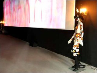 Sur la droite, un triple écran. Les Kyupi Kyupi font les choses en grand comme le révèlent le titre baroque et ronflant de la performance et celui des œuvres projetées quotidiennement : The Wide Show.
