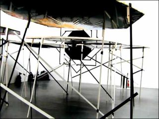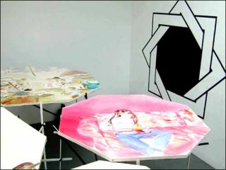 Les artistes anglais et allemands du groupe hobbypopMuseum investissent la galerie Ghislaine Hussenot de manière inattendue. Au rez-de-chaussée, on entre dans une installation composée d’échafaudages « de fortune » assez hauts pour que l’on puisse déambuler dessous, et qui soutiennent huit octogones plastifiés assez grands pour occulter presque totalement la verrière de la galerie. L’installation se compose également de lampes, de sacs poubelles, etc. Mais la surprise vient quand on monte à l’étage, sur la mezzanine : on découvre alors la face cachée des octogones. Il s’agit de huit peintures présentées à l’horizontale.