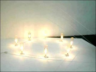 — Sans titre, 2003. 8 lampes-mobile : bouteille plastique, fils tendus entre deux murs, sol peint délimité par 8 côtés. Dimensions variables.