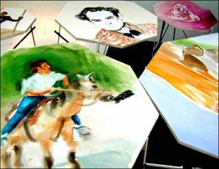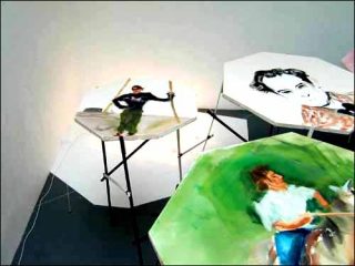 Tout en ne se limitant à aucun matériau, tout en abordant aussi bien la peinture, la sculpture, la vidéo et la musique que les installations et les événements, les artistes de hobbypopMuseum s’attachent à interroger la peinture et son accrochage. Les peintures présentées ici s’inspirent tour à tour d’images privées, d’images de magazines, de publicités ou d’icônes de la culture jeune. Elles sont traitées de manière très rapide comme pour annuler la préciosité et lenteur d’exécution propre la peinture. En outre, en présentant les toiles à l’horizontale, perchées sur des échafaudages, et perceptibles qu’en surplomb, hobbypopMuseum utilise l’architecture singulière de la Galerie Ghislaine Hussenot pour briser le dispositif classique d’accrochage.