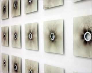 La tapisserie Entre Mundos (2013) et le mur doré érigé à l’entrée de la seconde salle de La Criée font quant à eux référence à la conquête de l’Amérique du sud par les espagnols et les portugais au XVIe siècle. Beaucoup plus proche dans le temps et brûlante, la projection diapositive Sea Grammar (2015) évoque silencieusement les migrations méditerranéennes actuelles.