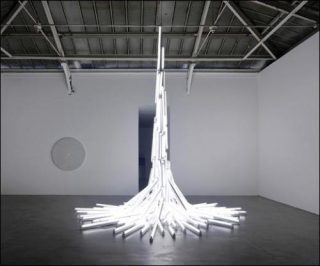 Jusqu’à preuve du contraire (03) se déploie donc comme une immense structure faite de néons allant jusqu’au plafond de la galerie. Sa morphologie nous ferait penser à un bûcher. Les néons horizontaux tiendraient la place des bûches disposées au sol, les obliques seraient le cœur du brasier incandescent, et les verticaux les flammes s’élançant vers les cieux. On pourrait alors y voir les bûchers de l’Inquisition espagnole et de ses inquiétants autodafés.