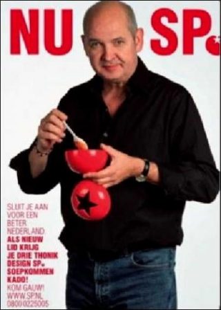 Thonik voit les choses en grand, mais c’est à l’échelle d’une typographie ou d’un signe qu’il répond à la commande. Pour le Socialist Party, une fonte en capitales et un emblème qui retrouve son rôle de ponctuation projectile et vitaminée: une tomate à la tige étoilée. En rouge et blanc avec une force ostentatoire… et décomplexée vis-à -vis des artifices de son leader, à la une avec un bol de soupe ou dans une vidéo virale où il brave divers obstacles à la communication avec son électeur, vous ! Ce travail de marque assure une fermeté à la position du parti et la singularité de sa nouvelle adresse. Les slogans « Ici et maintenant » ou « Globaliser autrement » prennent une dimension qui outrepasse les limites du papier, vers un mouvement dans le réel qui rend lisible leur efficacité.