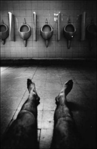 Peu à peu, les photographies de Marcos Lopez s’éloignent du principe d’identification annoncé dans son écrit. Parmi elles, seule une image est cadrée depuis l’œil du photographe, depuis deux jambes étendues sur le carrelage de toilettes publiques qui ouvrent la perspective jusqu’aux pissotières. Ces scènes, des débuts de Lopez, teintées de naturalisme et bien que non exemptes des clichés du genre (noir et blanc, petit ou moyen format, avec son lot d’adolescents pauvres esseulés dans des intérieurs décrépis, Chambre d’étudiants, 1980 par exemple), n’en conservaient pas moins une certaine proximité avec leurs sujets.