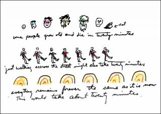 Les «sculptures motorisées» de Breer (Tableau, 1965; Tank, 1966; Borne, 1967; Rug, 1968) sont animées d’un mouvement imperceptible qui amène le spectateur à en prolonger la contemplation. Au contraire, les vidéos de l’artiste ne laissent pas de repos à l’œil. Le film Time Flies (1997), dont le titre, qui est aussi celui de l’exposition, résume l’esthétique de l’ensemble des œuvres exposées, est un montage rapide de dessins et de photographies. Le temps est perçu comme un flux, où la contingence des choses et des êtres est palpable. Dans son Hommage à John Cage (1963), Robert Breer fait référence à cette notion de hasard, importante également dans le travail du compositeur.