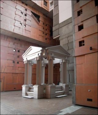 Charles Jencks déclinait ainsi avec son service le langage formel des colonnes antiques; dans son objet en béton Tea & Coffee, Piazza d’Italia in Post-Katrina Times, Isa Melsheimer combine les plans de Charles Jencks avec la Piazza d’Italia, que la ville de New Orleans réalisa en 1978 (Charles Willard Moore, architecte). Conçue jadis