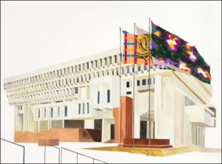 Sur un objet en tissu rappelant les dessins de George Hardie, Isa Melsheimer met en scène dans une broderie sensuelle, douce et néanmoins provocante deux célèbres édifices romains: la Pyramide de Cestius, un tombeau dont la construction a été achevée en l’an 12 avant J.-C., et le Palazzo della Civiltà Italiana, terminé en 1943 dans le cadre du projet d’urbanisme de Mussolini dans le quartier EUR (Esposizione Universale Romana).
