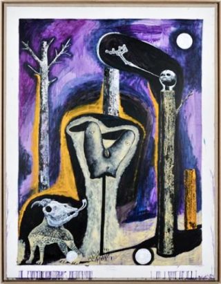 On pénètre dans l’exposition de Damien Deroubaix comme on s’égarerait dans un drôle de rêve, dans un cauchemar éveillé où se disputent des figures fantasmagoriques dégénérées. D’emblée, Messiah nous immerge dans un monde désolé, crépusculaire, post-apocalyptique. Comme si la grande catastrophe avait finalement eu lieu et que seuls quelques vestiges de notre civilisation subsistaient sur terre. Trois colonnes fluettes se dressent dans un paysage sombre. Seul le halo de la lune apporte un peu de clarté à la scène, Damien Deroubaix complétant le fond noir de ses toiles de quelques aplats verdâtres et violacés. Un crâne et un drapeau, signes d’une humanité perdue, vainement tournés vers le ciel, attendent la venue incertaine d’un messie qui, apparemment, aura été précédé par un mouvement de destruction massive. Plus aucun espoir ne subsiste, comme aucune douceur n’est désormais possible: les fleurs même ne sont au mieux que de maigres et piquants chardons.