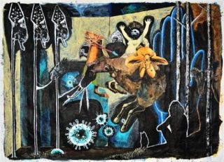 — Damien Deroubaix, Furies, 2014. Aquarelle, acrylique, encre et collage sur papier. 330 x 450 cm.