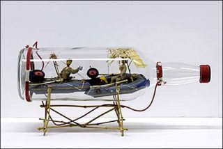 Entre pièces à conviction et souvenirs de voyages, les œuvres de Tixador et Poncheval témoignent de leurs exils: s’inscrivant dans la tradition artisanale des marins, les deux artistes confectionnent des bouteilles dont le contenu se compose de déchets ramassés durant leur voyage ou d’objets bricolés avec les matériaux disponibles pendant l’expérience. Ces bouteilles, «art des déracinés», les mettent en scène sous la forme de petites poupées, bonhommes et frêles, transposées dans un milieu qu’elles subissent.