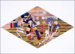 Les tableaux de petits formats en forme de losange flottent littéralement dans le même espace que les toiles monumentales. Les œuvres sont regroupées autour de trois thèmes: passé, présent et futur. Des peintures comme Past: at the soshimai In shin-yoshiwara (2011) qui représentent des scènes intimes liées à l’image traditionnelle du Japon ainsi que d’épisodes de violence issus de l’histoire récente du pays, appartiennent au premier groupe d’œuvres. Dans des toiles comme Present (2011) on assiste, au contraire, à des scènes effrayantes de destruction bizarrement associées à des visions oniriques. Comme souvent dans ses œuvres, Aya Takano imagine un monde à l’envers où des villes futuristes et ses habitants ne sont pas soumis aux lois de l’attraction et errent librement dans les galaxies (Future: with their foundations in outerspace, metropolises float in mid-air, 2011 et Future: cities shaped like internal organs and cubic vehicles, 2011).