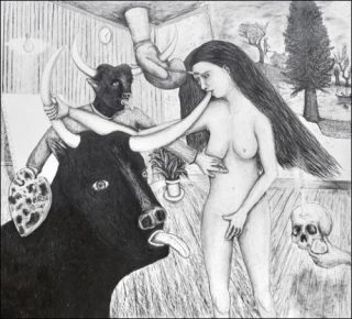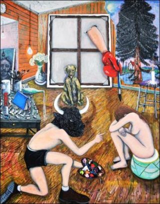 Des figures symboliques récurrentes constituant son répertoire sont mises en scène de peinture en peinture, également parfois de peinture en dessin. Le clown (série 2011-2012), évocation de la dérision et de la mise à distance, comme la figure du minotaure dans ses peintures plus récentes, se situe au centre de l’éternelle dualité de la vie et de la mort, au sein des pulsions ambiguës et fondamentales d’Éros et de Thanatos. Le minotaure, qui est ancré dans l’imagerie populaire et dans l’histoire de la peinture, sollicite le thème de l’autoportrait: Corne est le nom de l’artiste. De ses peintures plus anciennes, on se souvient des scènes de boxeurs. Le symbole du gant de boxe en est une résurgence persévérante. Elle est une métaphore de la peinture comme combat: le peintre boxeur, la peinture comme ring de boxe, le ring… Mais ce qui pourrait être une expression de violence, d’intrusion impromptue, s’avère finalement être une figure pudique de l’amour: un gant rouge d’émotion gorgé de sang, comme un cÅ“ur amoureux mis en parallèle avec la palette du peintre en forme de cÅ“ur. Amour céleste, charnel, et amour de la peinture se confondent d’un même souffle en une même nécessité, pour une même aspiration. Le titre de l’exposition: «Ton cÅ“ur a la forme du gant de boxe avec lequel je peins tous tes contours» est par ailleurs explicite: du ring au cercle, du verbe à l’image…