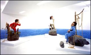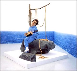 La galerie Emmanuel Perrotin accueille trois sculptures de Tony Matelli. Pour l’occasion, le bas des murs a été recouvert d’un papier peint représentant la mer. Au milieu de la pièce, trois autoportraits de l’artiste sont posés sur des rochers. Les personnages sont des mannequins hyperréalistes en silicone. En passant devant la galerie, la vision de ces personnages est trompeuse, mais même de loin on s’aperçoit que les proportions entre la tête et le corps ne sont pas respectées. Bien que les mannequins soient habillés avec des pantalons, des pulls, des chaussures, malgré le souci de réalisme, ces personnages sont carnavalesques et clownesques à la fois, même si ils portent leur regard au lointain, dans une attitude vaguement méditative et romantique.