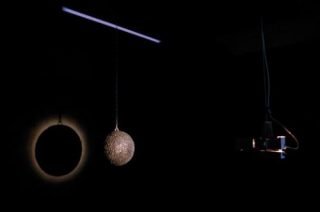 Dans « Total Eclipse », le propos de Tony Regazzoni est heureusement tout autre. Le dispositif qu’il convoque est d’une grande simplicité. Une installation centrale rejoue une éclipse miniaturisée, et trois tableaux pyrogravés en représentent les différentes étapes. L’ensemble est plongé dans le noir.