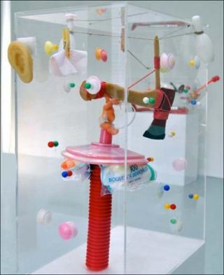 Honoré δ’O quant à lui explore un langage plastique pluridimensionnel. Avec des objets au départ insignifiants, glanés par-ci par-là , il se lance dans des compositions prenant des allures de sculptures complexes qui s’inscrivent dans l’architecture environnante. Le tout s’emboîte comme des poupées gigognes, les objets vont et viennent, déploient leurs tentacules ou se replient sur eux-mêmes. L’artiste traite le moindre bout de tuyau plié ou calciné comme un objet précieux. Il ne fait aucune distinction de valeur.