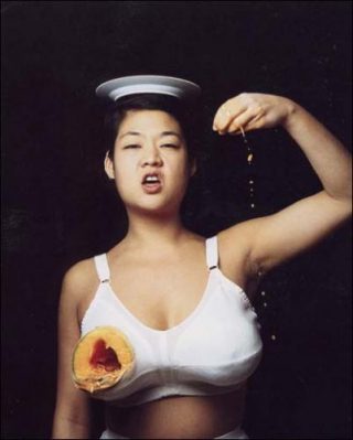 Plus loin encore, dans une vidéo de Patty Chang, Melons, autant terrifiante que drôle — une fois qu’on a compris le subterfuge —, l’artiste mange littéralement son sein à la petite cuiller, un sein qui est en fait un melon en guise de prothèse mammaire.