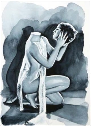 On en veut pour preuve cette composition sobre et peu spectaculaire s’intitulant La gifle. Deux athlètes y sont représentés dans un mouvement qui nous donne la trompeuse impression d’être synchronisé. Nous savons d’après les sources dévoilées par l’artiste que nous sommes en compagnie ici d’une lanceuse de disque participant à une compétition sportive sur le territoire palestinien, prise en photo par Liselotte Grschebina en 1937, et de Erwin Hubert, discobole nazi immortalisé par Leni Riefensthal un an auparavant. L’une comme l’autre peuvent se vanter d’avoir un physique avantageux et photogénique et se sont en conséquence fièrement pliés à leurs objectifs respectifs. Mais leur identité de même que celles de leur photographe, sans même parler des lieux où ils ont été photographiés, les rendent bien entendu incompatibles. Réunis au sein d’une même image et d’une chorégraphie de circonstance, les athlètes juive et allemand sont donc fédérés par la traduction picturale et ses nuances de gris qui font écho aux sources photographiques.