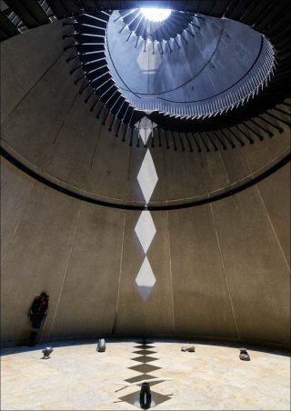 Une installation en néons est la première œuvre que l’on découvre : un Y lumineux accroché sur le phare. Cette lettre qui traverse l’ensemble de l’œuvre de François Bouillon est pour la première fois réalisée en néons. Elle est à la fois une référence directe à son support, le phare dont elle reprend en l’inversant la forme conique, et une référence indirecte aux cultures Inuit et Dogon auxquelles s’est beaucoup intéressé François Bouillon. Chez ces peuples, le Y représente l’être humain.