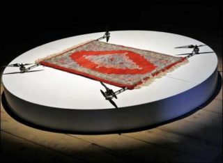 C’est également sur la terrasse de Dar Ben Jelloun que Moussa Sarr a réalisé la vidéo L’appel (Série Points de vue). Utilisant un symbole français et en référence à son passé colonial, l’artiste Corse d’origine Sénégalaise provoque une joute sonore avec les coqs de la médina et les mosquées des alentours. L’écho se répercute, revient et repart, pointant l’idée de reconnaissance entre pairs. D’autre part, réalisée à partir d’un tapis de prière en laine, l’œuvre Rising Carpet est selon les mots de l’artiste: «le premier vrai tapis volant au monde». Objet hybride et fascinant mêlant technologies actuelles et artisanat traditionnel, l’œuvre met en exergue les clichés de l’orientalisme et les crispations liées à la religion Islamique.