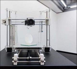 A cette image plane imprimée sur tapis répond une sculpture d’aluminium froissée posée sur un cube de plexiglass. Ce vocabulaire minimal fait d’ailleurs écho à la pierre blanche de Temple of zoom, qui trône sur une imprimante 3D comme un silex ancestral. Un outil technologique dernier cri acheté sur Internet en Chine et monté en kit, cohabite avec un simple caillou. On se trouve donc balloté entre technologie de pointe et archaïsme. Le silex marque effectivement les débuts de la «techné» à l’aube de l’humanité. L’imprimante 3D, débranchée et purgée de ses fils, se transforme quant à elle en un socle pour la sculpture, en une scène, en un décor de théâtre, en un lieu d’exposition. Le caillou blanc acquiert alors une fonction cultuelle, comme s’il s’agissait d’un objet magique, intégré à un rituel religieux, qui jouirait d’une véritable aura.