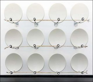 — Pierre Clément, Ultra High Frequencies, 2015. Satellite antennas, bambo, feathers, moss, aluminium brackets, satellite heads. 270 x 220 x 90 cm.