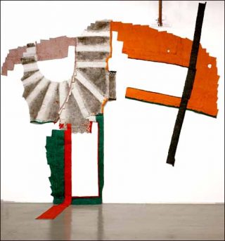 Ces carapaces évidées ont été obtenues par moulage d’autres murs. Une superposition de rectangles de toile vierge, enduits d’acrylique coloré ou non, a recouvert le bâti d’un lieu élu par l’artiste. Puis, rendu à son usage habituel, il est livré aux passages, et au travail qui s’y effectuent, qui encrassent alors les parties en contact avec les corps.