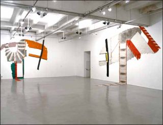 Max Charvolen déploie sur les murs du Credac de grandes fresques colorées et aériennes. Fixes, elles n’en sont pas moins déplaçables, délocalisables. Ce paradoxe tient à l’utilisation du mur d’exposition comme support et réceptacle de la mise à plat d’une sorte d’écorce en longs lambeaux effilés.