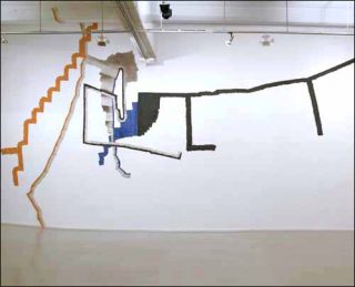 L’empreinte du lieu devient aussi celle de son occupation, comme une peau en prise directe avec la vie, qui est ensuite arrachée, puis incisée pour se déployer en bandes tentaculaires à même les murs d’exposition. Marches noircies et contremarches claires, les escaliers montent au ciel dans la tradition de la peinture illusionniste des fresques antiques, alors que les lancers de couleurs s’agrippent, grimpent et ouvrent l’espace, dans une fusion baroque du lieu originel et du lieu d’accueil.