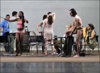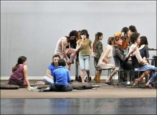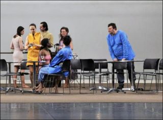 Empreinte d’une récente performance, l’exposition évoque la transe collective. Sur scène, un modeste décor rappelle la neutralité de certaines salles municipales. Après un repas convivial, un groupe hétérogène — enfants, adultes, femmes et hommes — interprète une gestuelle individualisée, autonome et répétitive, en musique. L’espace est structuré, les enfants sur des coussins, les adultes autour des tables, un sentiment de groupe émerge malgré les partitions indépendantes à chacun. La vision globale de la scène en un plan fixe et lointain qui englobe l’ensemble des participants — eux-mêmes sur un même plan — incite à la curiosité, et à la déambulation du regard. Delphine Doukhan crée des perméabilités entre images en mouvement et photographie. Les boucles de visuels scandés se confondent avec les morceaux de Bach joués à la flûte sur scène, lancinants et répétitifs. Mêlés également à l’ambiance sonore: la présence de Delphine Doukhan — de façon continue et ténue par ses échos entrainants —, les rumeurs des enfants, des modulations de voix étranges.